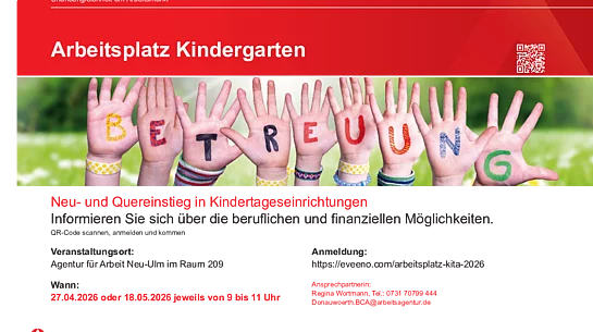 Quereinstieg KiTa – Deine Chance! Regina Wortmann, die Beauftragte für Chancengleichheit der Agentur für Arbeit Neu-Ulm, bietet zum Thema…
