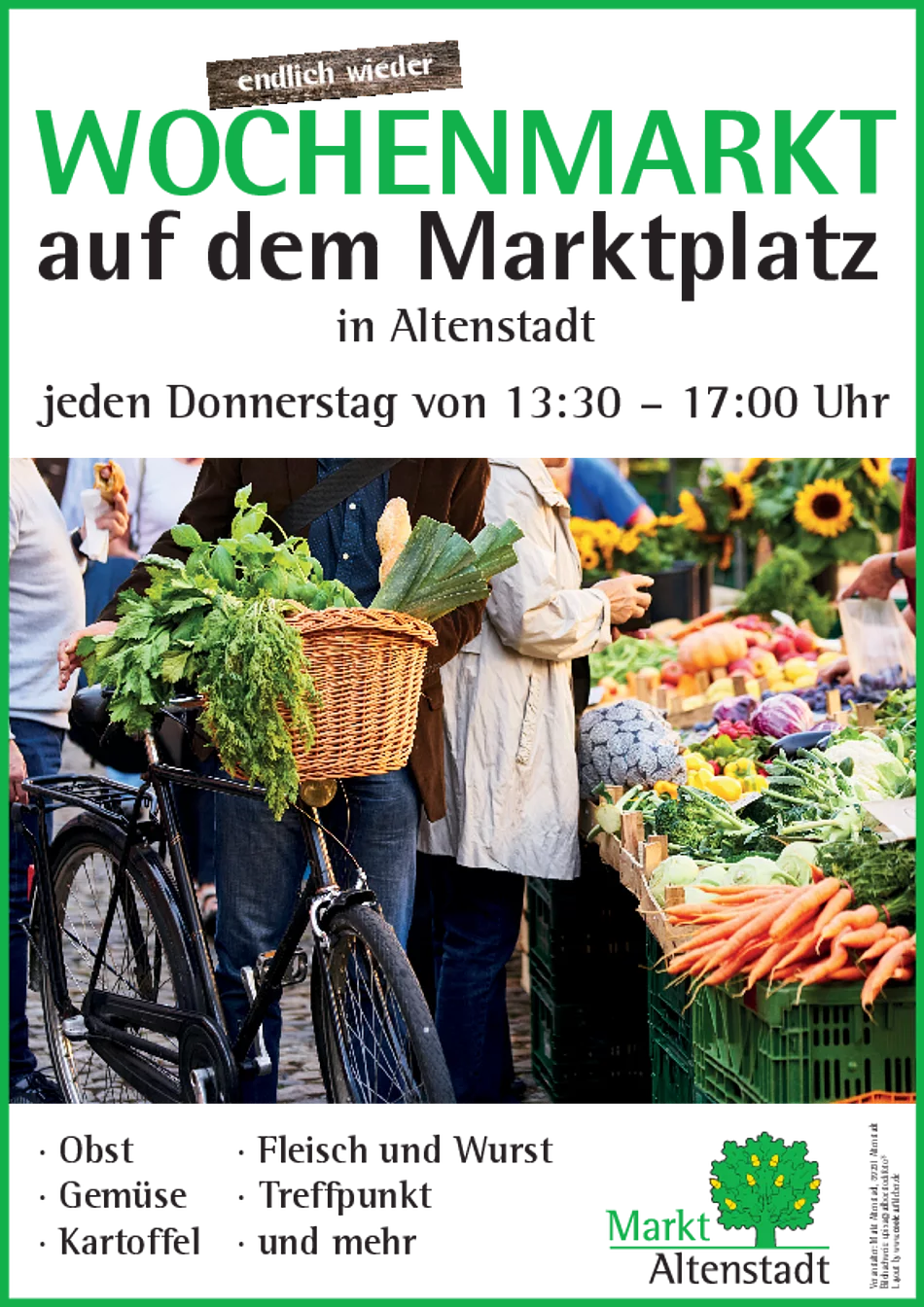 Ab dem 26. Oktober findet jeden Donnerstag von 13:30 bis 17:00 Uhr wieder ein Wochenmarkt auf dem Marktplatz statt.